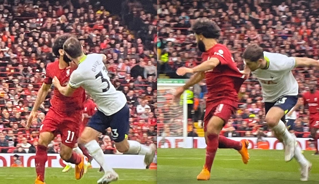 Salah was blocked off by Ben Davies with a grab at the front of his shirt (left picture), then dragged back by the back of his shirt, before Salah shrugged him off … and was penalised!