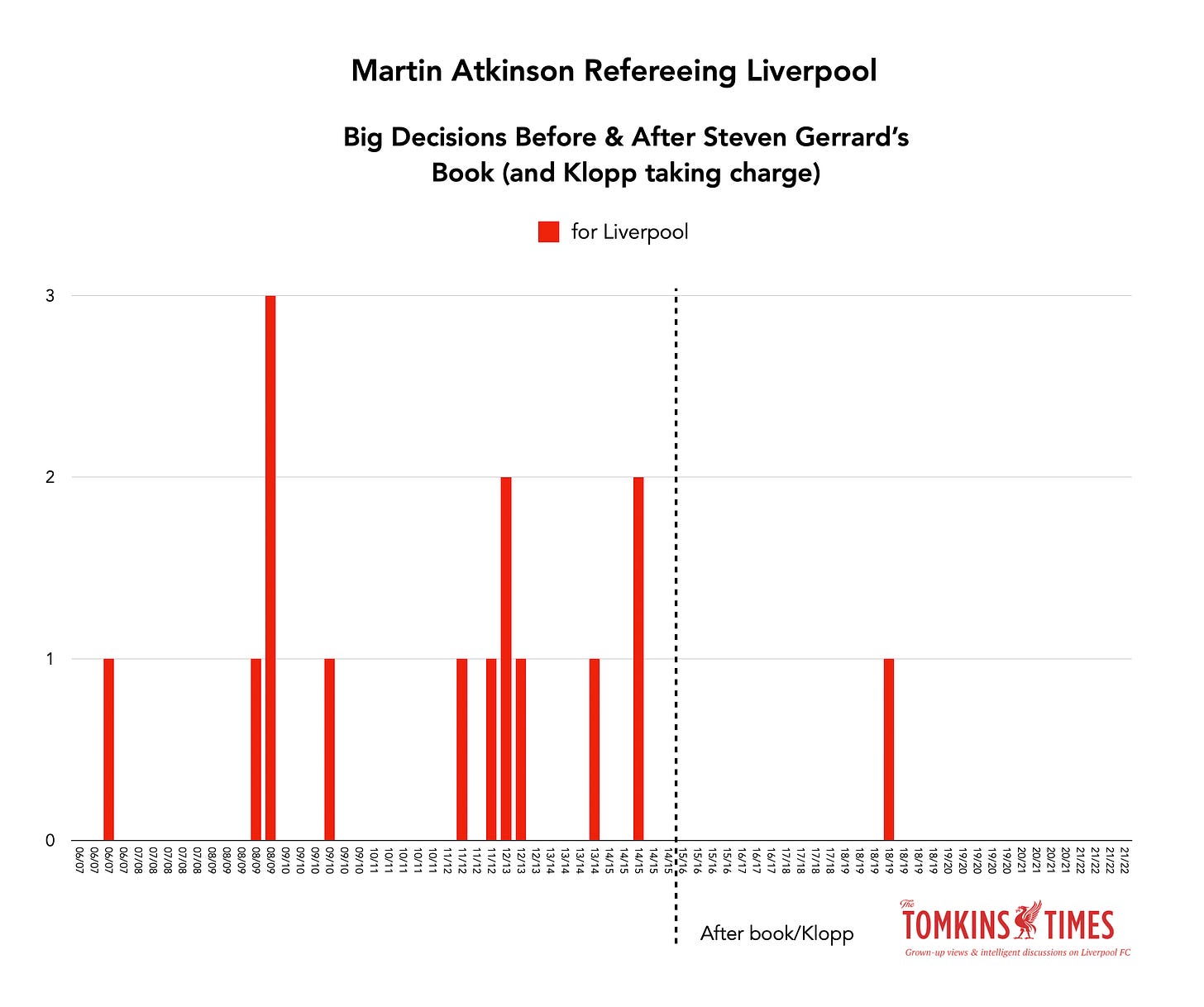 When Liverpool players were clearly hacked over the box (such as Naby Keïta in a key game against Leicester in 2019), nothing. Atkinson just walked around the pitch and took his money. He gave Liverpool just one Big Decision in his final 29 games (and two to the opposition). It seems impossible for there to be so many incidents in games up to 2015, and so few incidents thereafter.