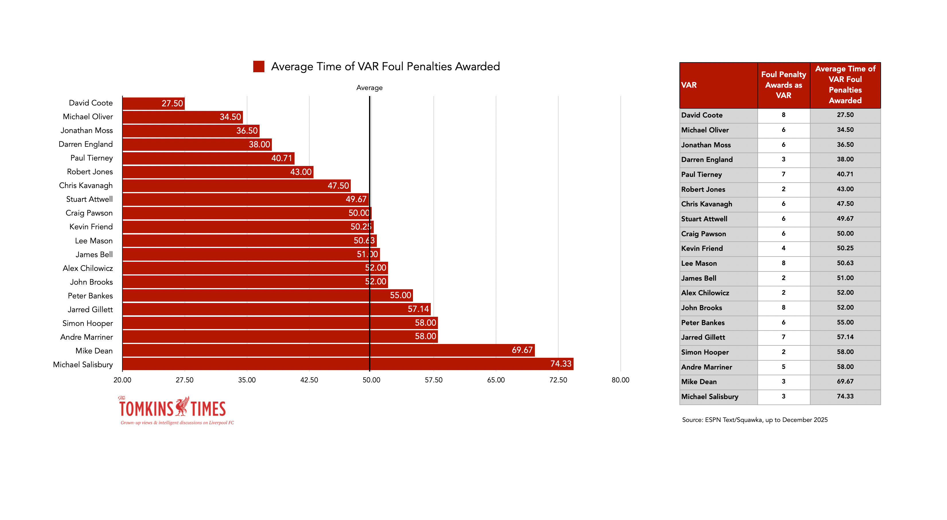 Of the 20 VARs to have awarded at least two foul penalties, Coote is a reasonable distance away from everyone else in terms of how early his interventions were. Only one ref is remotely close. (Michael Oliver.)