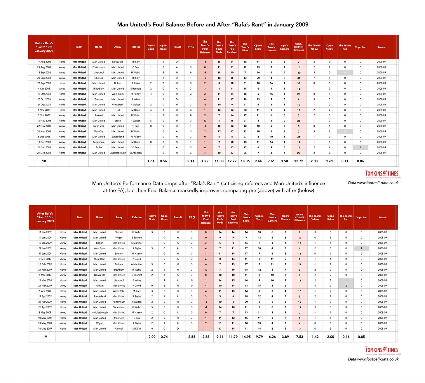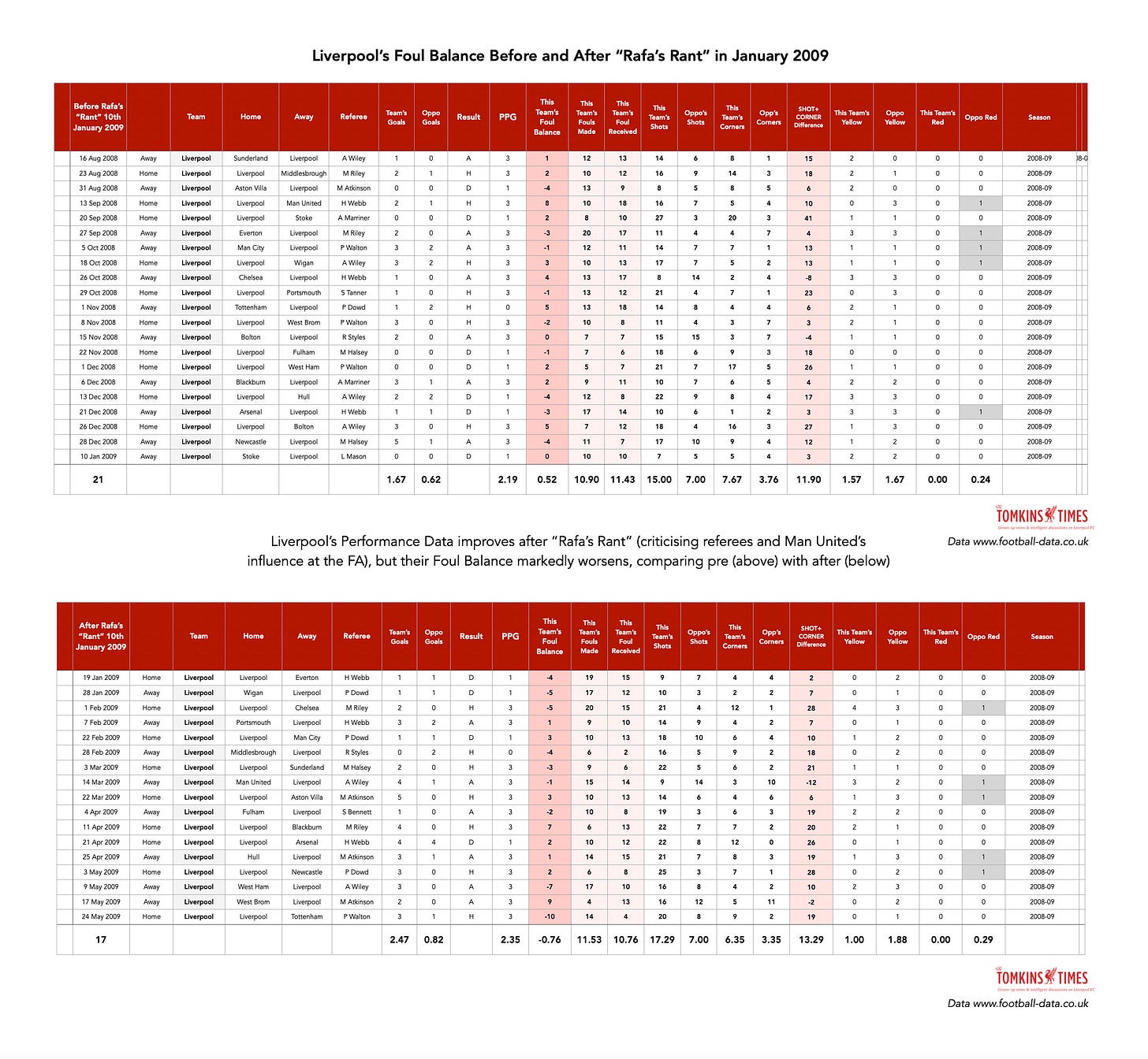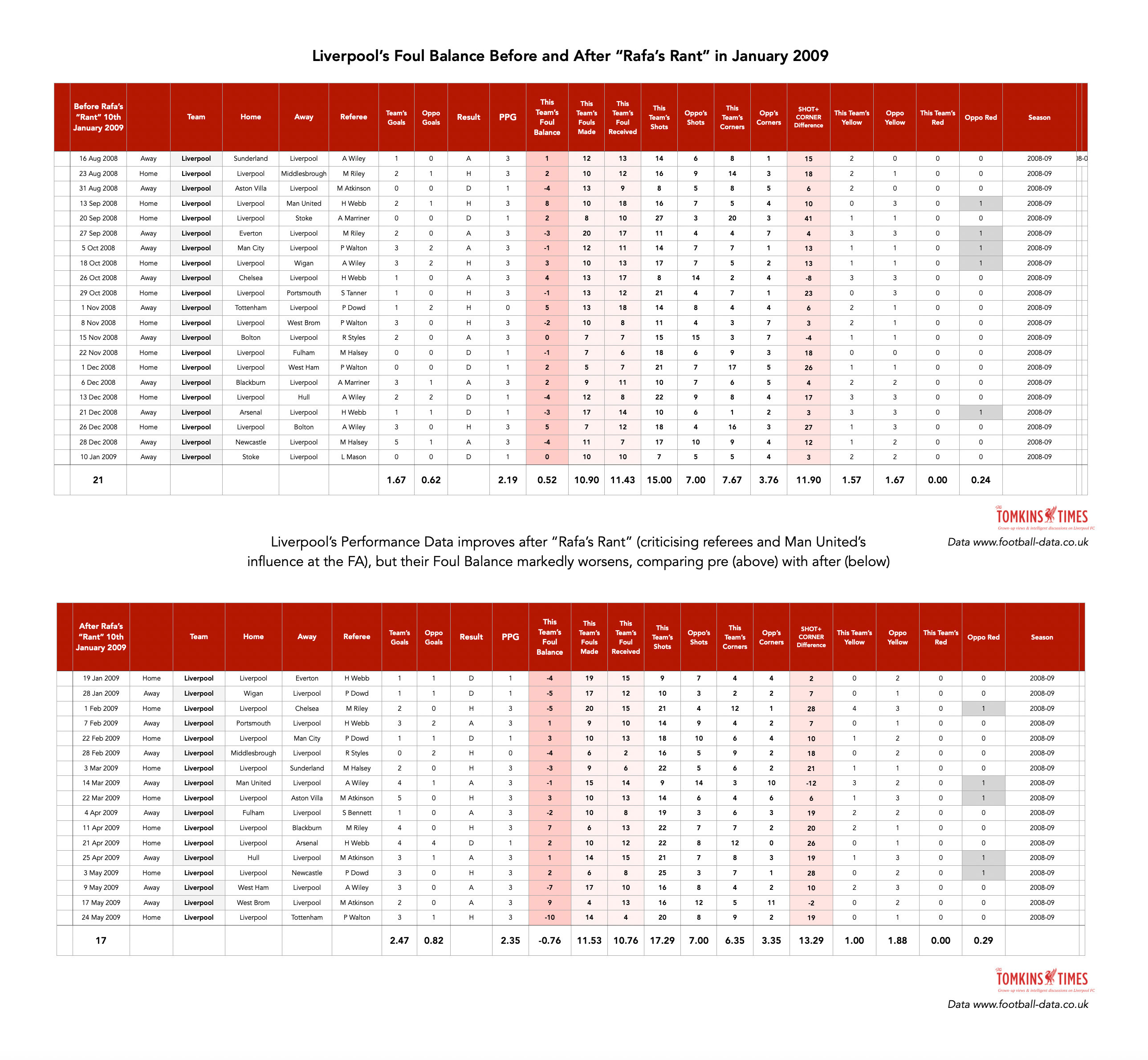 In January 2009, immediately after Rafa Benítez criticised the FA and its Manchester United’s connections regarding officials, Liverpool’s Foul Balance tanked and Man United’s shot up; despite Liverpool’s match-data getting better in the run-in and United’s getting worse.