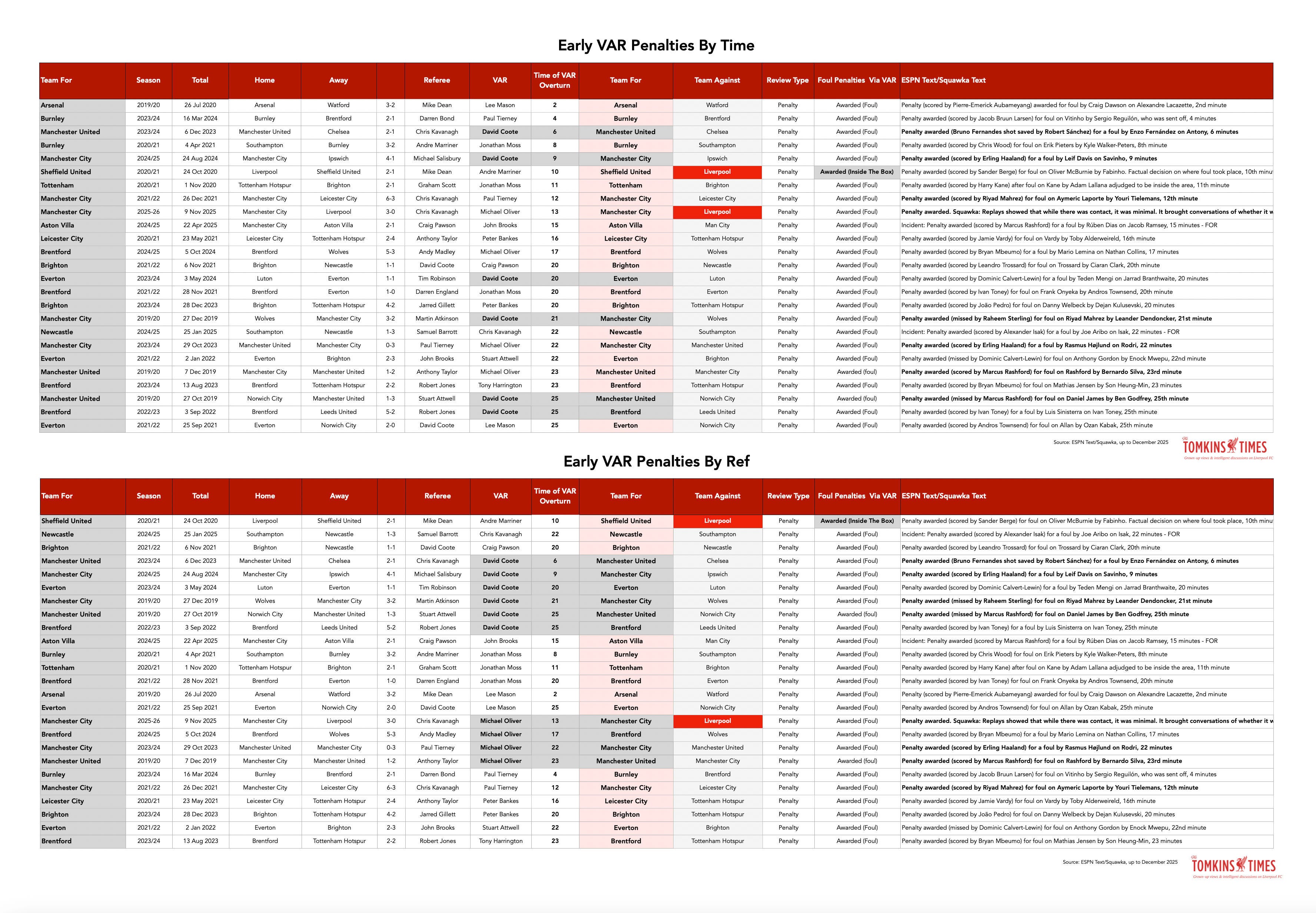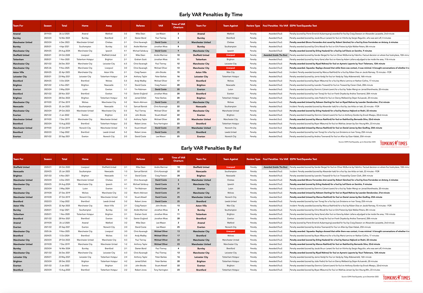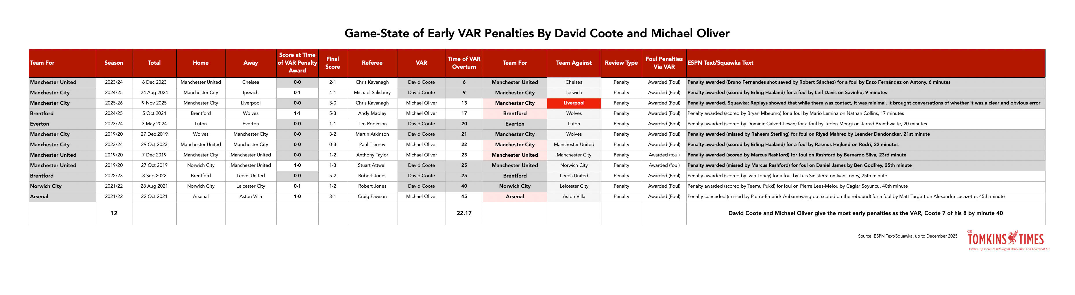 Remember that these early penalties may be valid, but Coote comprises a big chunk of early-given VAR penalties. (And remember how some clubs, like Liverpool, will not get early penalties at all, via refs or VARs.)