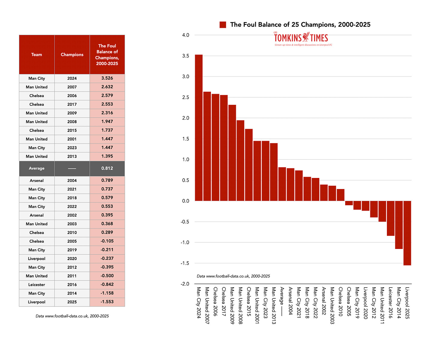 Only eight of the past 25 champions (32%) had a negative Foul Balance. This includes Liverpool in 2019/20, too.