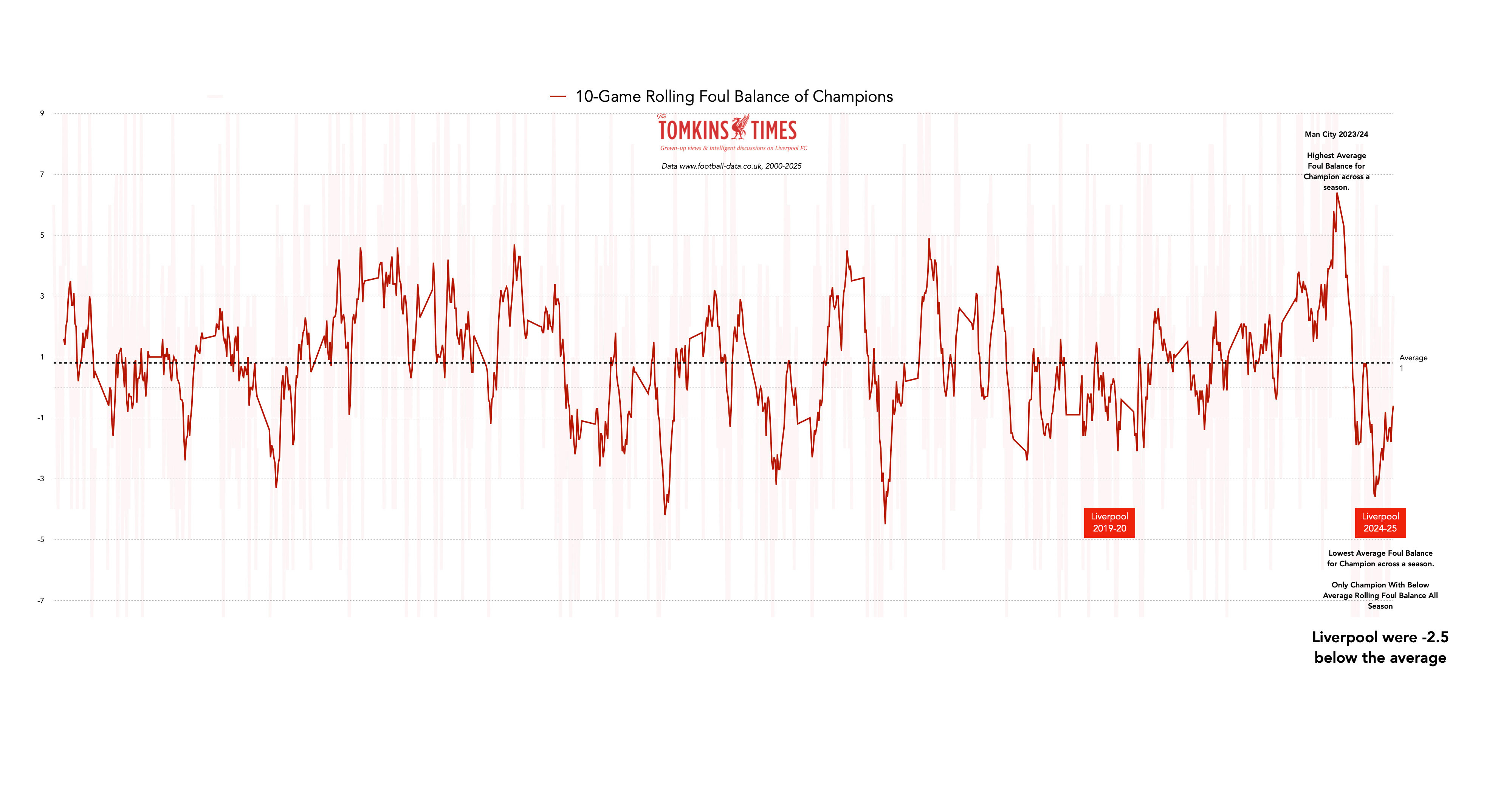 Liverpool were the only champions in the past 25 years who never once had an above-average (rolling 10-game) Foul Balance at any point of the season. As Liverpool started to pull ahead, the negative Foul Balances racked up massively until the title was won early. This shows the remarkable job Arne Slot did, taking what was deemed an impossible job in following Jürgen Klopp with a team in need of a rebuild sometime soon.