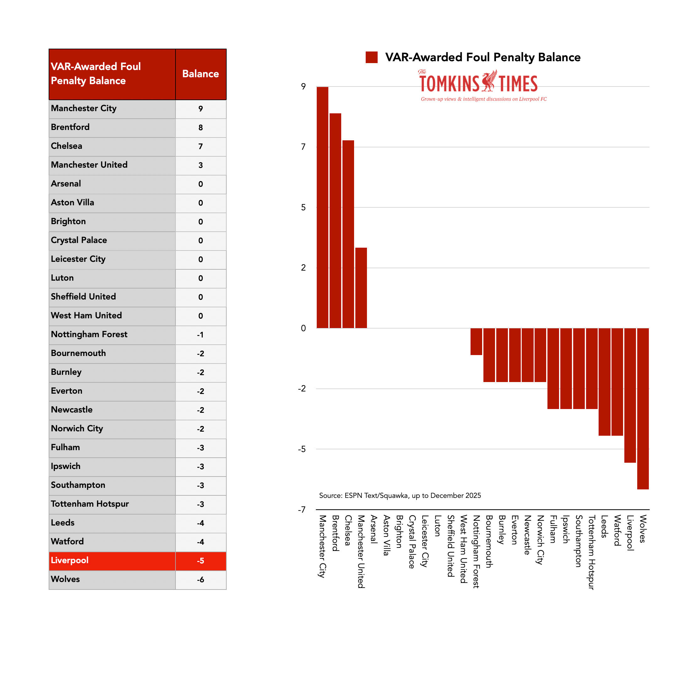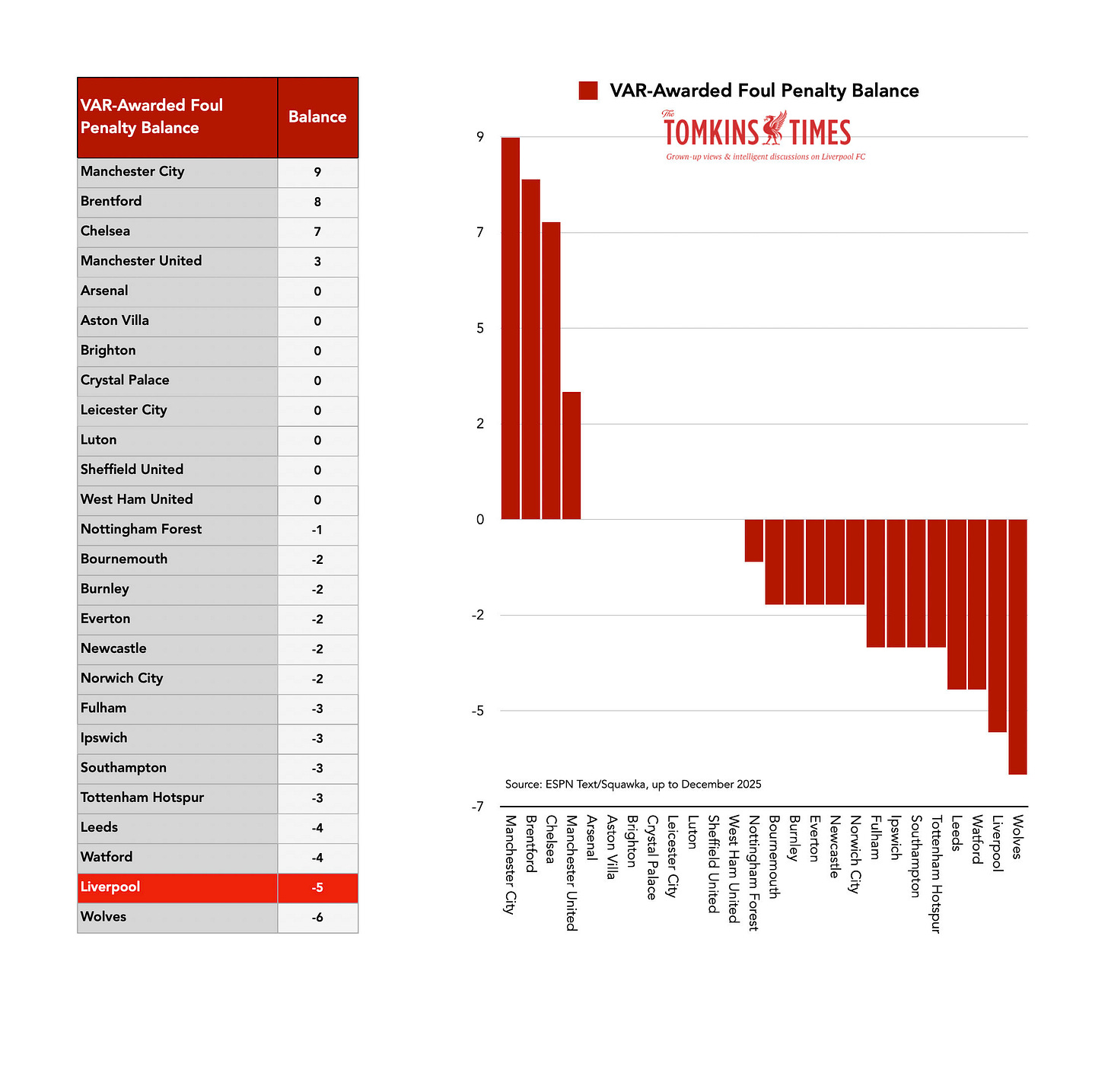 The lack of fouls can be seen in how VARs do not give Liverpool foul penalties (see yesterday’s article linked below).