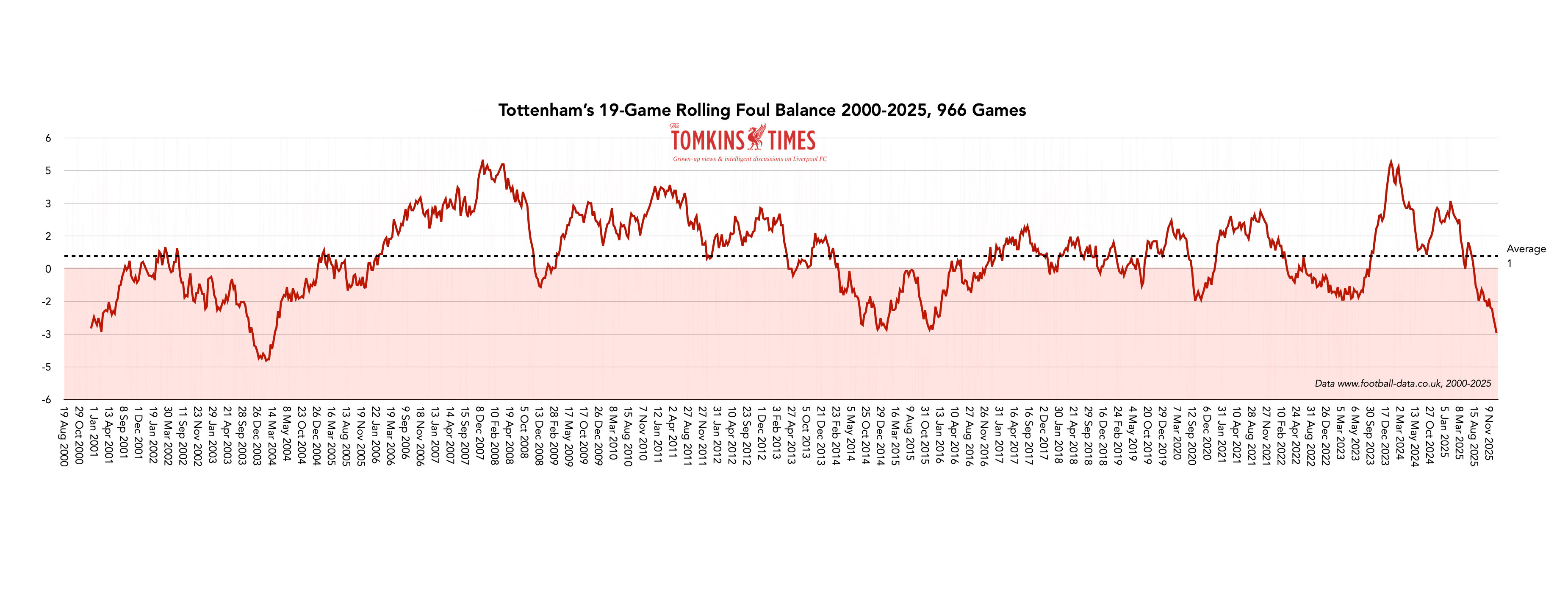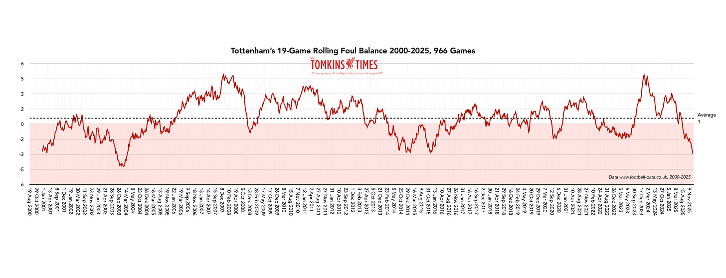 But it’s odd that a much better, more dynamic team like Liverpool between 2017-2025 should fare so much worse. I’ve also pointed out how Ange Postecoglou’s Spurs had a massively positive Foul Balance, and they were careless, reckless, manic, and for a while, great fun to watch. They kept winning the Foul Balance even with some nutters in their team.