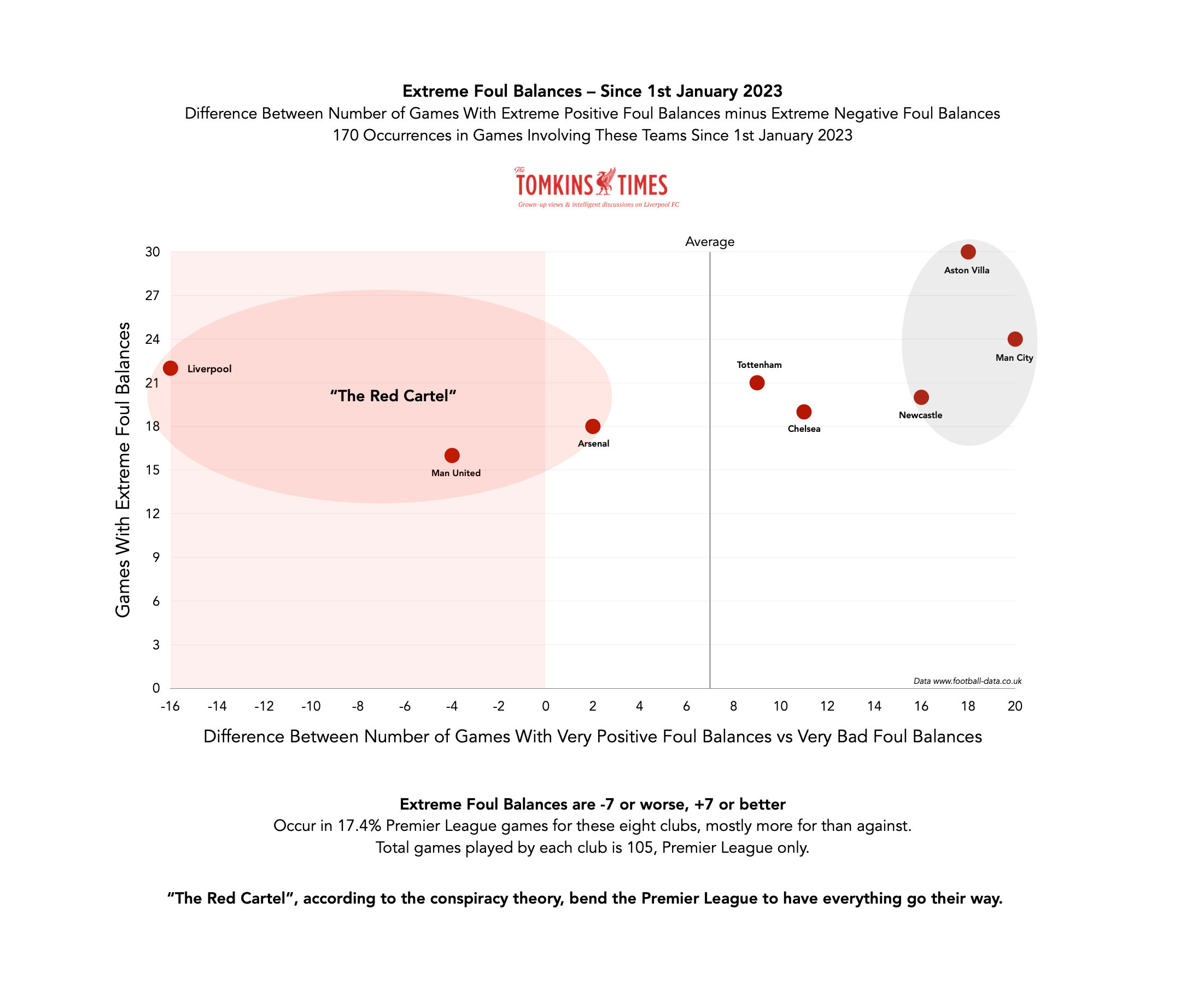 Yet since 2023 (and at times before), this supposed ‘Red Cartel’ are all likely to be far more harshly treated by refs and VARs; while Man City, Newcastle and Aston Villa (whose owner is connected to Man City’s due to moving to their country and voting in line with them on financial issues) are the leaders in Foul Balances and VAR overturn data.