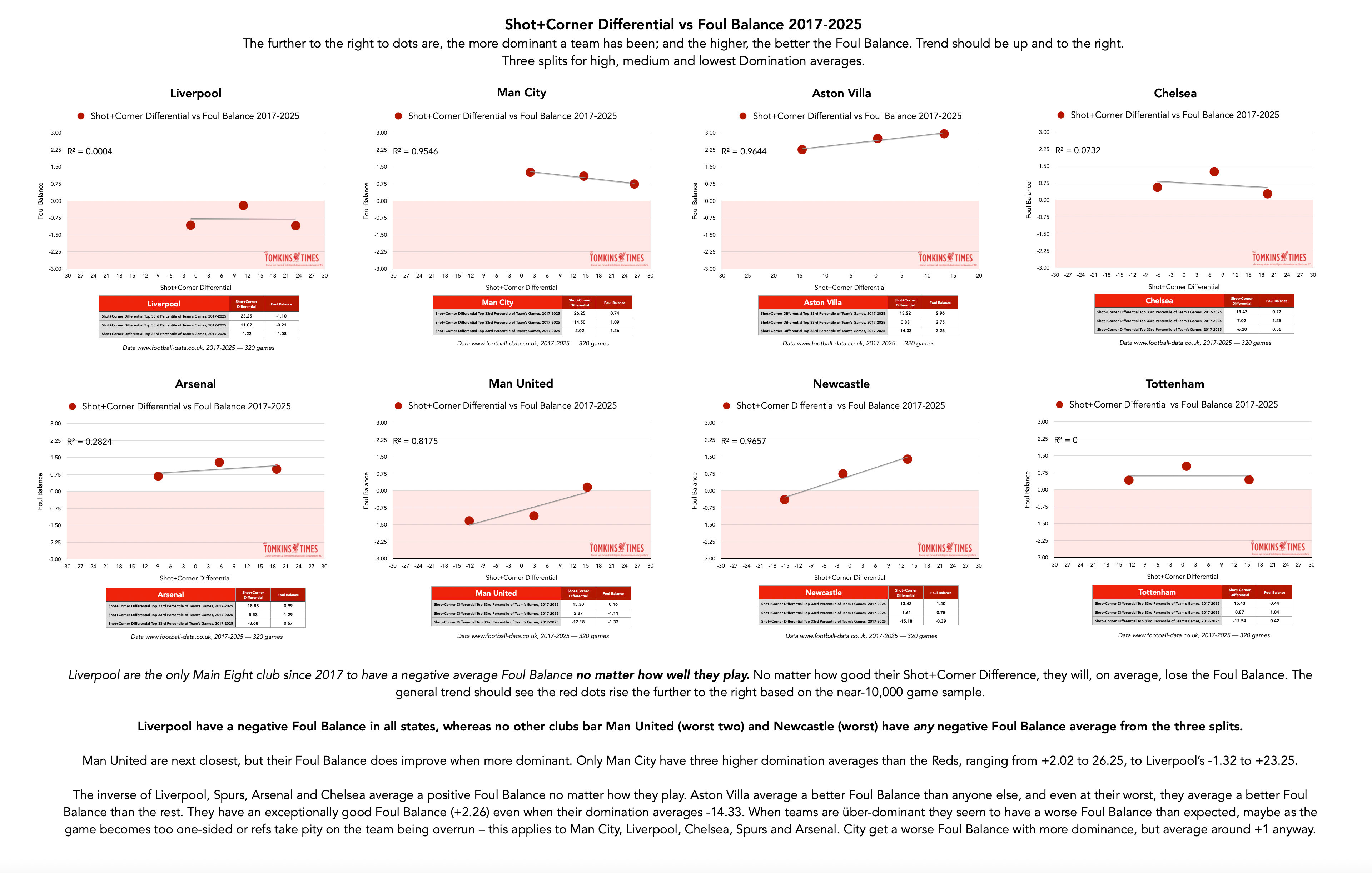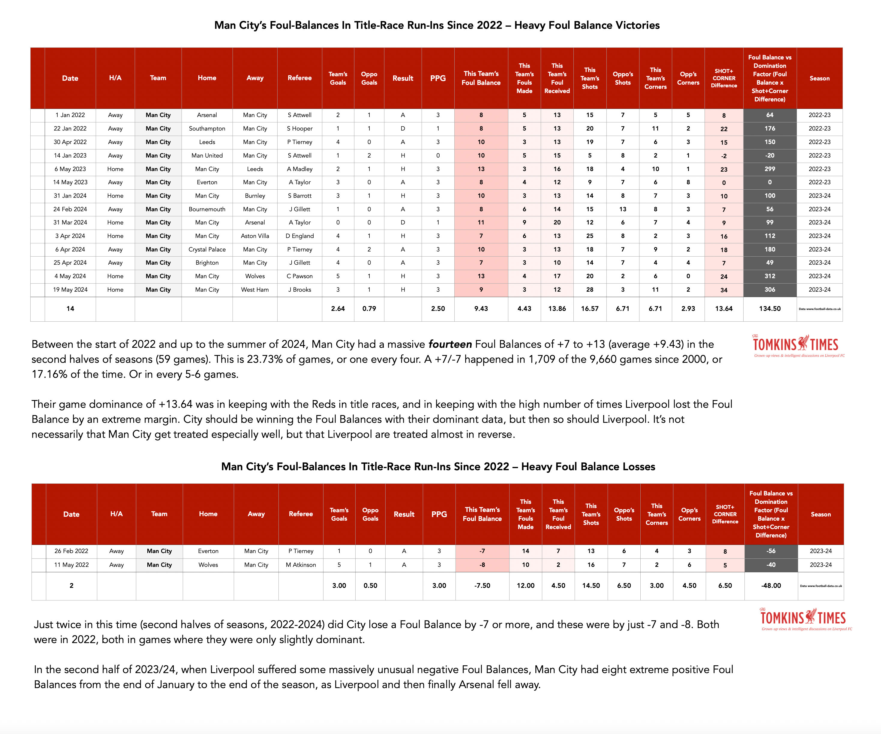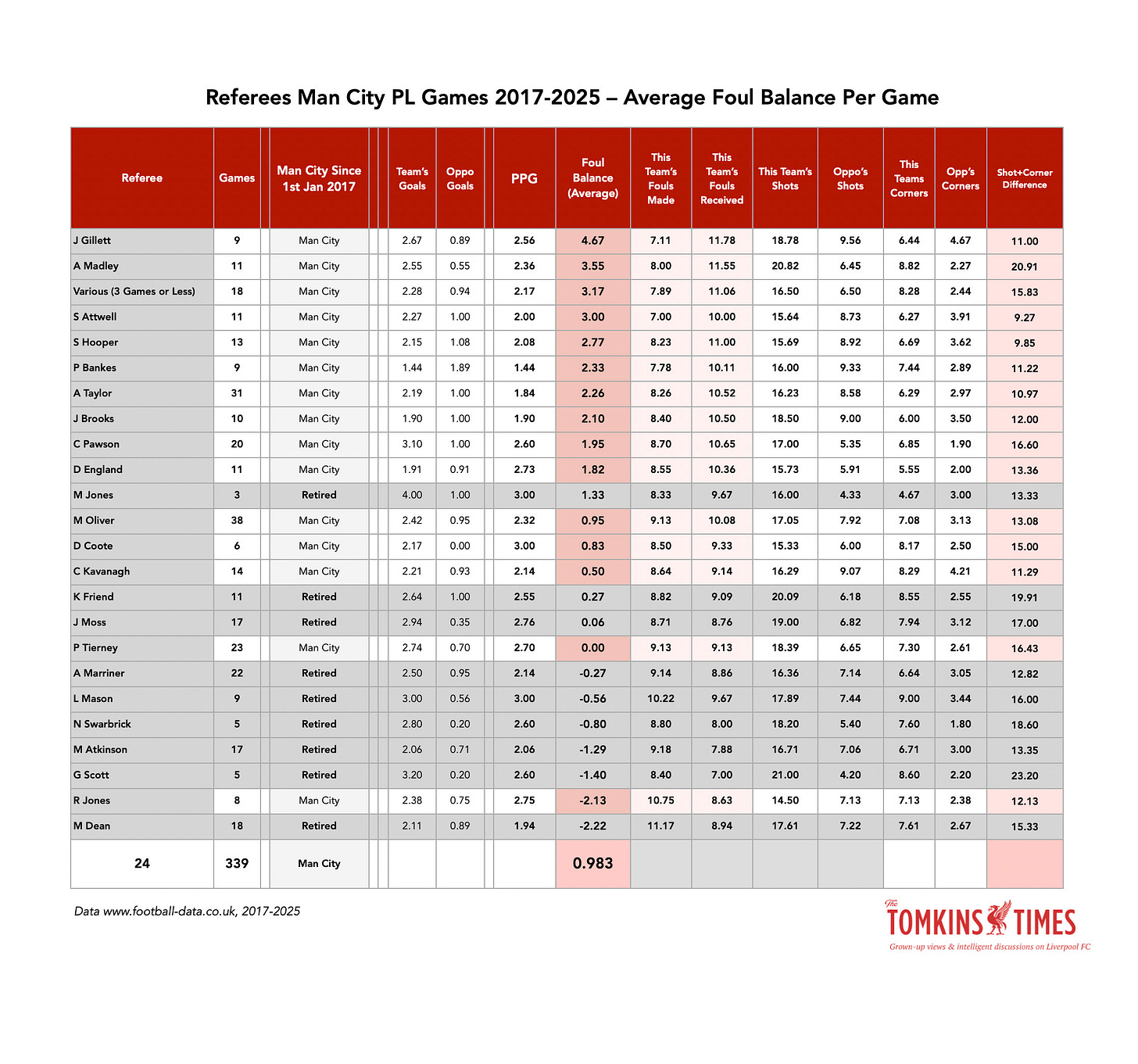 While Liverpool have three of the five most illogical Foul Balances in the near 10,000-game sample of all teams since the days of dial-up internet, the worst is Michael Oliver in 2019, when City dominated Spurs to a ludicrous degree yet heavily lost the Foul Balance; however, this was ‘only’ a -12 Foul Balance, so not as extreme in that sense as Coote’s -14 against Liverpool in similar circumstances.