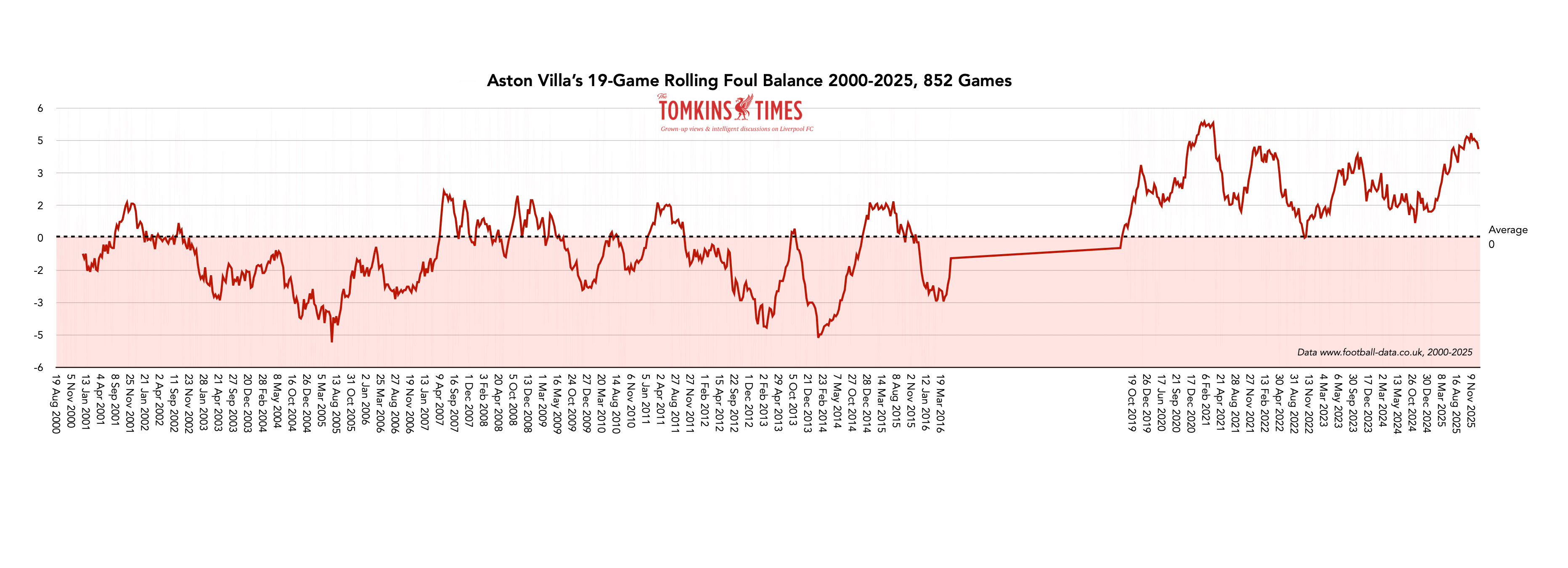 Again, to use as a comparison, Villa – and don’t ask me why! – have won 20+ foul free-kicks on no fewer than 16 occasions simply since 12th July 2020 (they were not in the Premier League from 2016-2019). And most recently, when Chris Kavanagh was reffing them at home to Wolves in 30th November 2025. And that’s a lot since Jack Grealish left in 2021.
