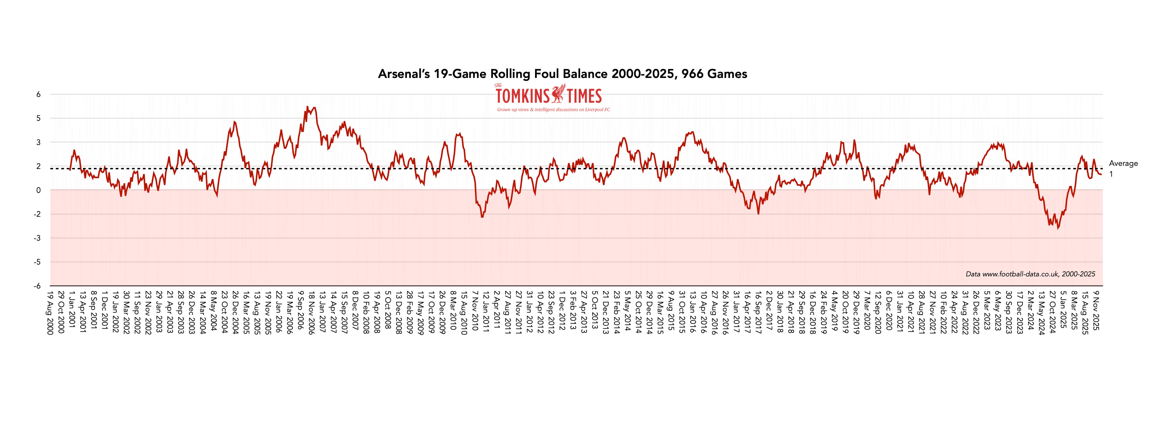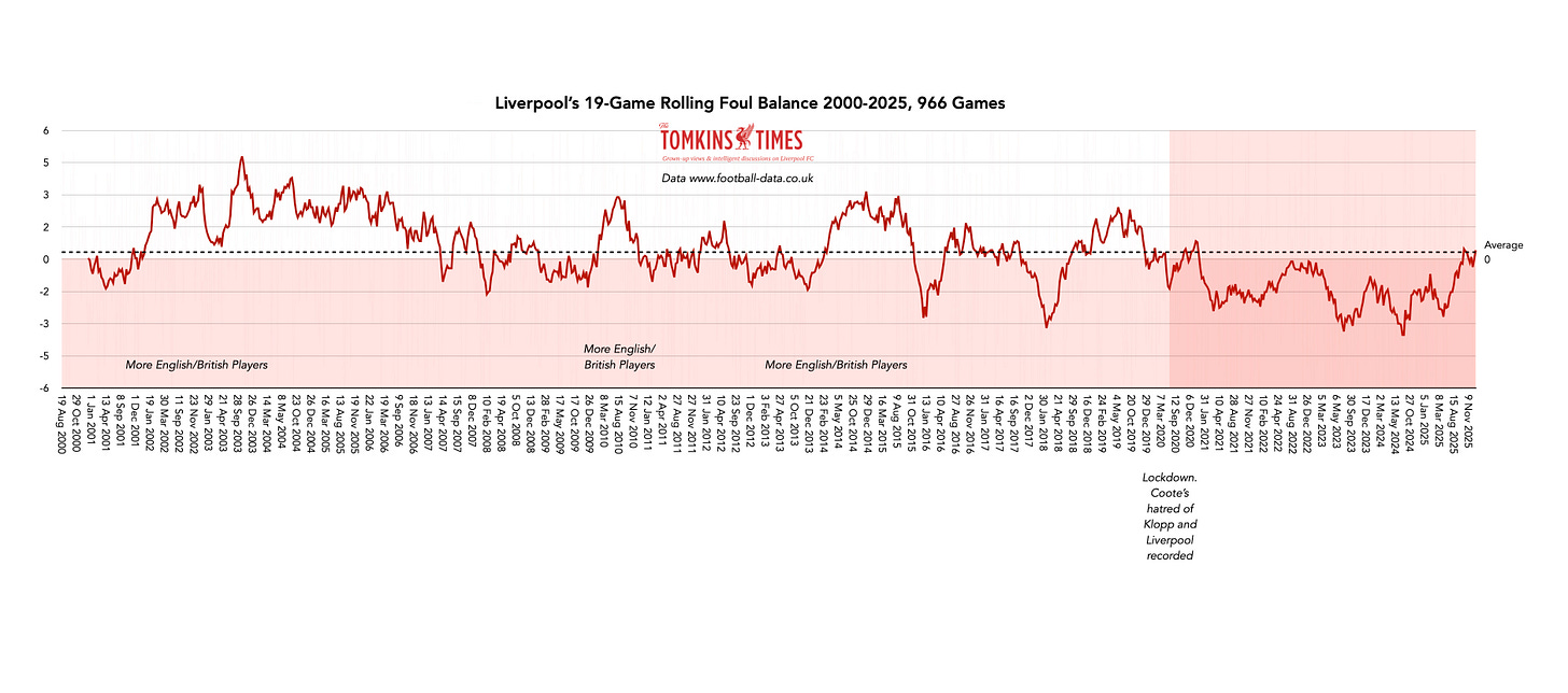 The Reds’ Foul Balance peaked in 2003. (When fairly rubbish based on memory and the performance data, but with the XI full of English players.)