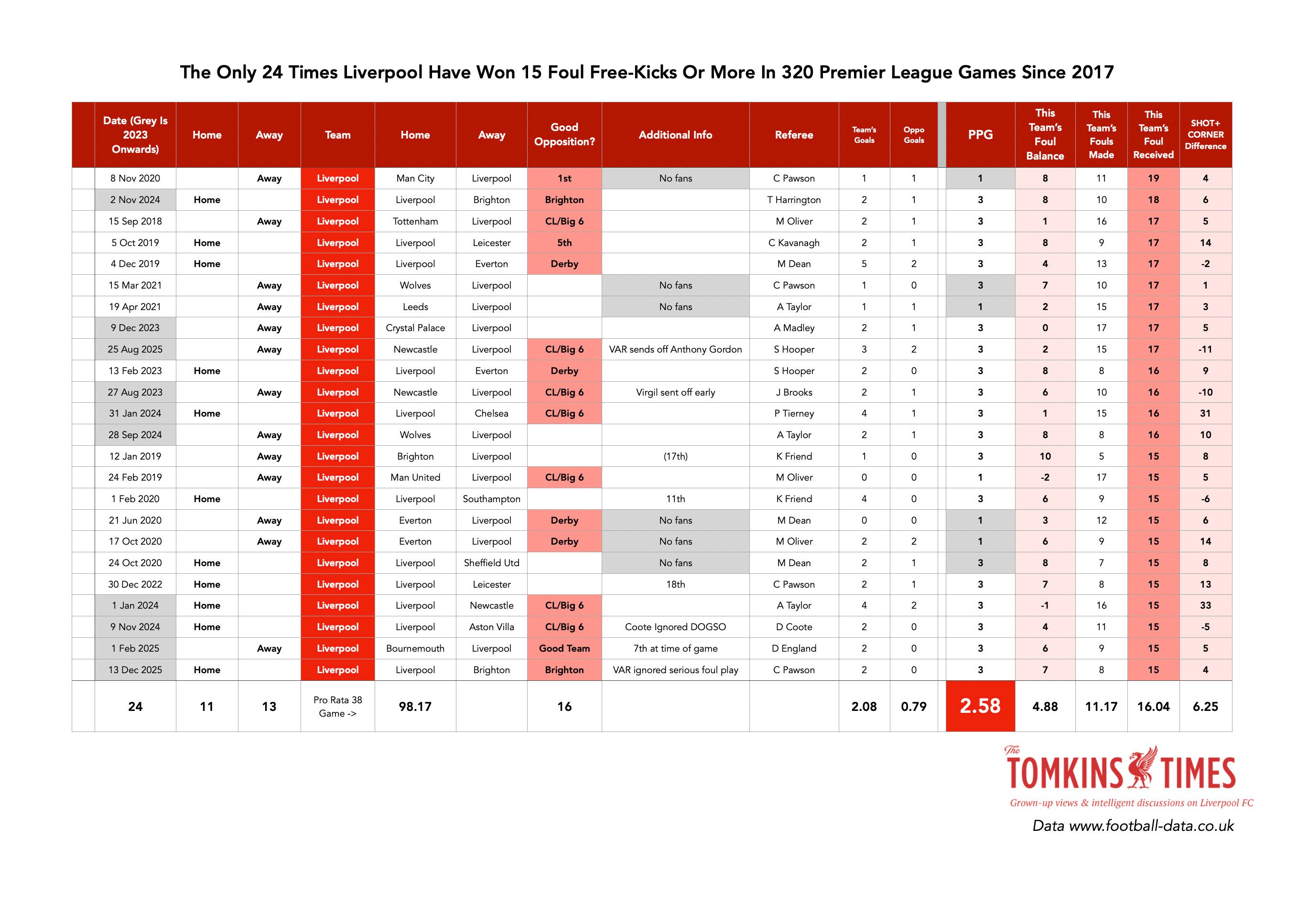 Liverpool have three of the five most illogical Foul Balances, and four of the 12 worst. All since 2021. And the Coote game against Brighton is the worst Foul Balance in this list.