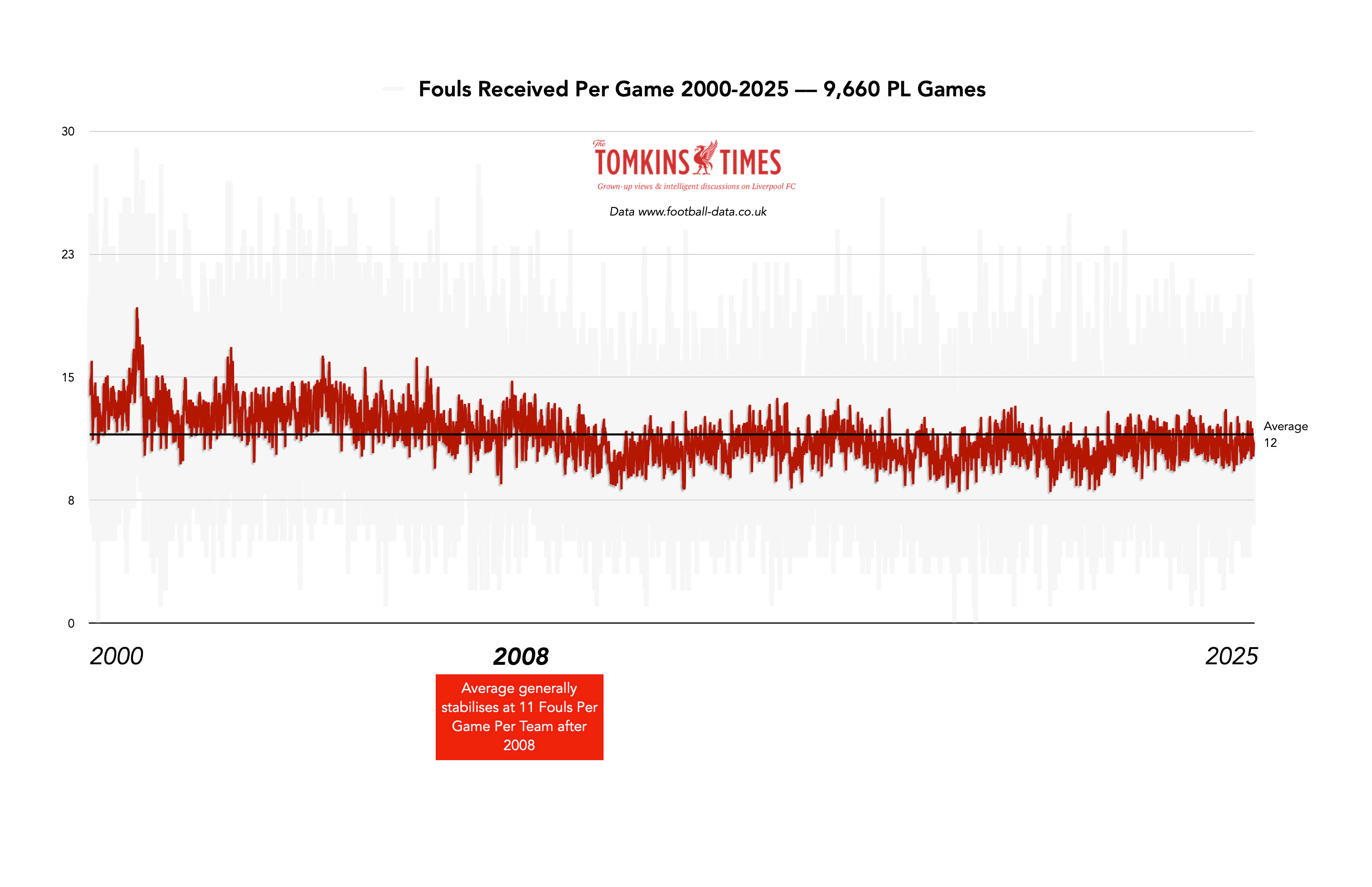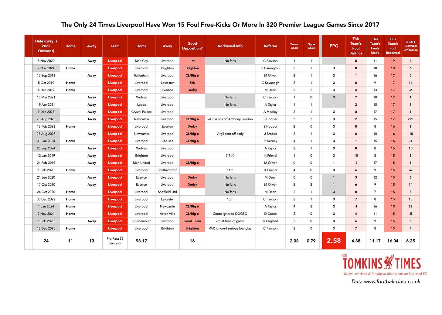 Since 2017, Liverpool have received 15+ foul free-kicks a game just 24 times in 323 league games, or just 7.43% of matches.