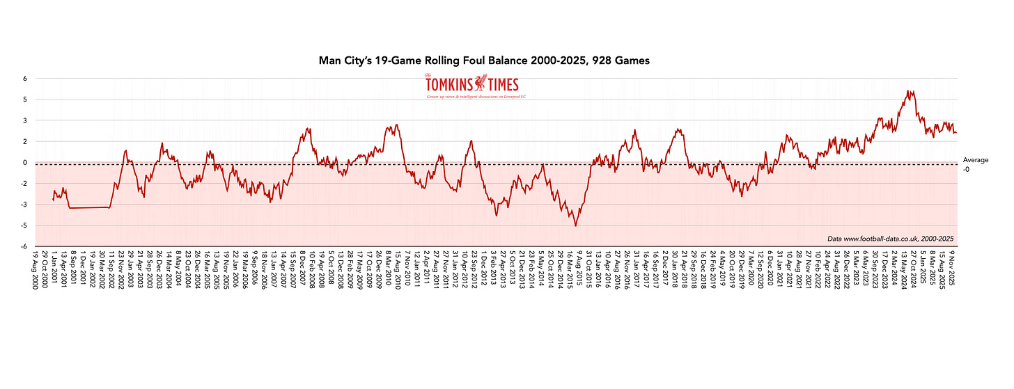 Man City’s Foul Balance hasn’t always matched their superiority (most recently failing to do so in 2019), but it has much more in recent times, especially 2023/24 in the three-way title race that went their way on the back of some terrible officiating blunders and they got a remarkable Foul Balance.