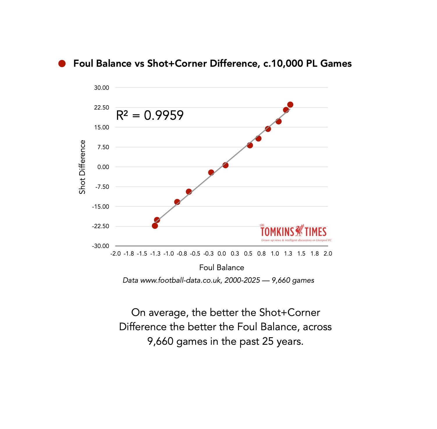 If you plot it on a chart and take a dozen random large samples of game-domination and Foul Balances, the correlation is 99.9% between better a team’s stronger match data and higher Foul Balance; yet obviously individually this does not apply (hence Liverpool).
