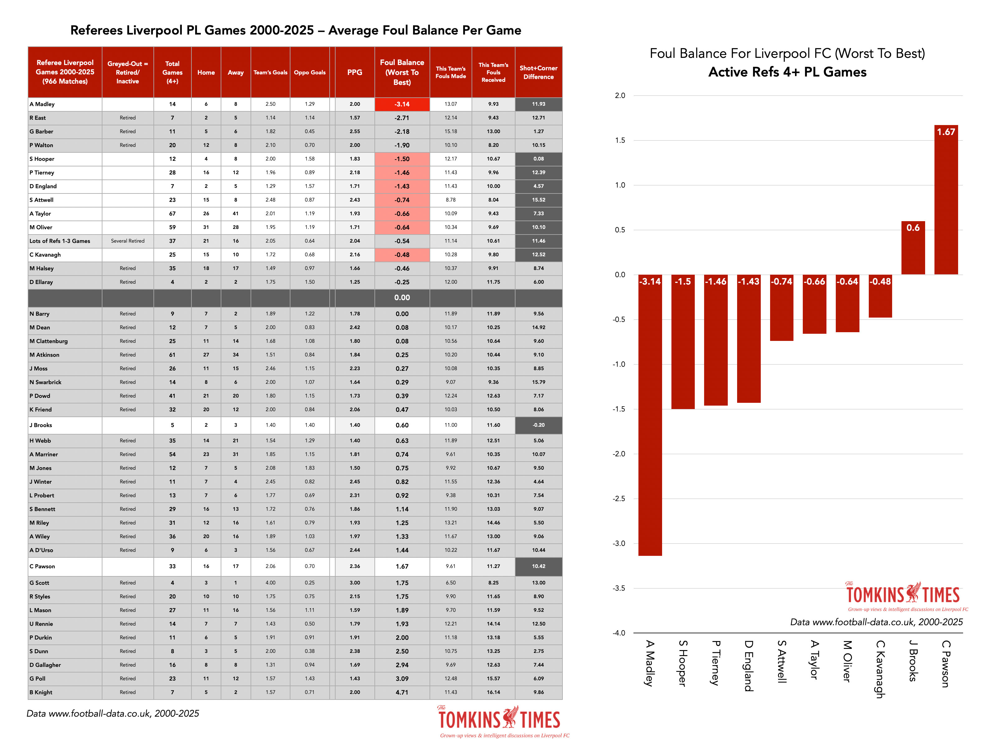 I predicted against Nottingham Forest that Madley would give a bad Foul Balance to the Reds of around -3, as his average, and he did. He gave the Reds only eight free-kicks against a very physical side, and 11 to Forest. Bang-on. I then predicted Craig Pawson would give the Reds a better Foul Balance against Brighton, and he did. I feared Attwell against Sunderland, and he was terrible. I said Brooks might be okay at Spurs, and he was. I feared Chris Kavanagh against Leeds, and I was right to. I correctly predict this shit every week now.