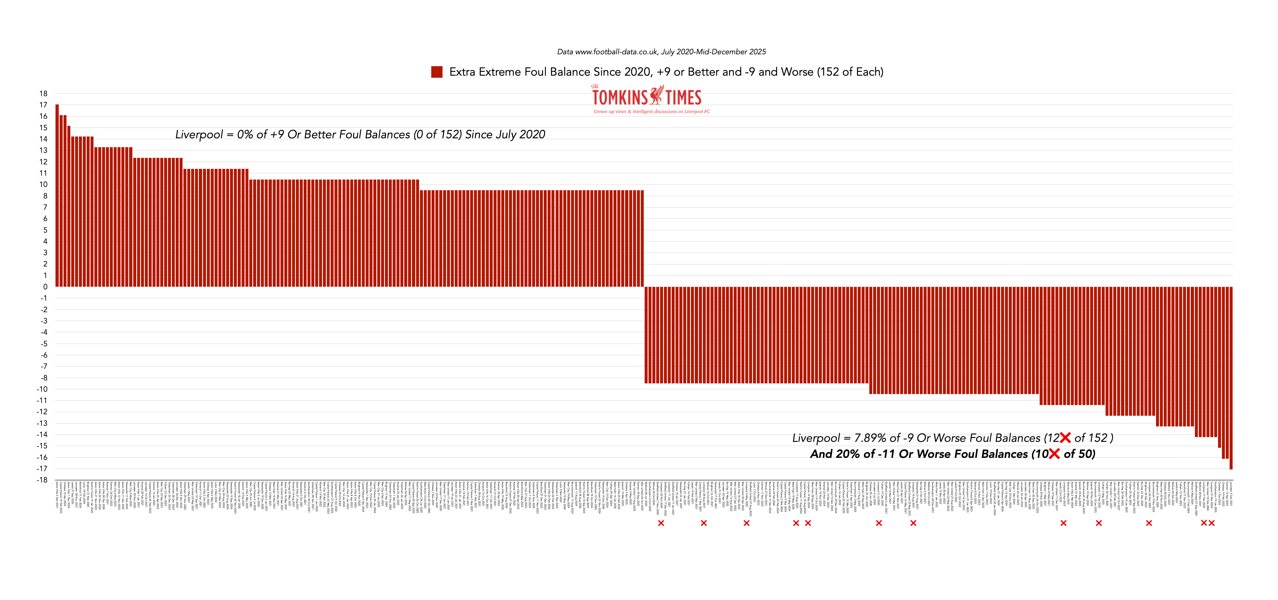 Since 2020, and with all data correct as to a few games ago, there had been 152 instances in all Premier League games of a Foul Balance of +9 (and thus 152 of -9).