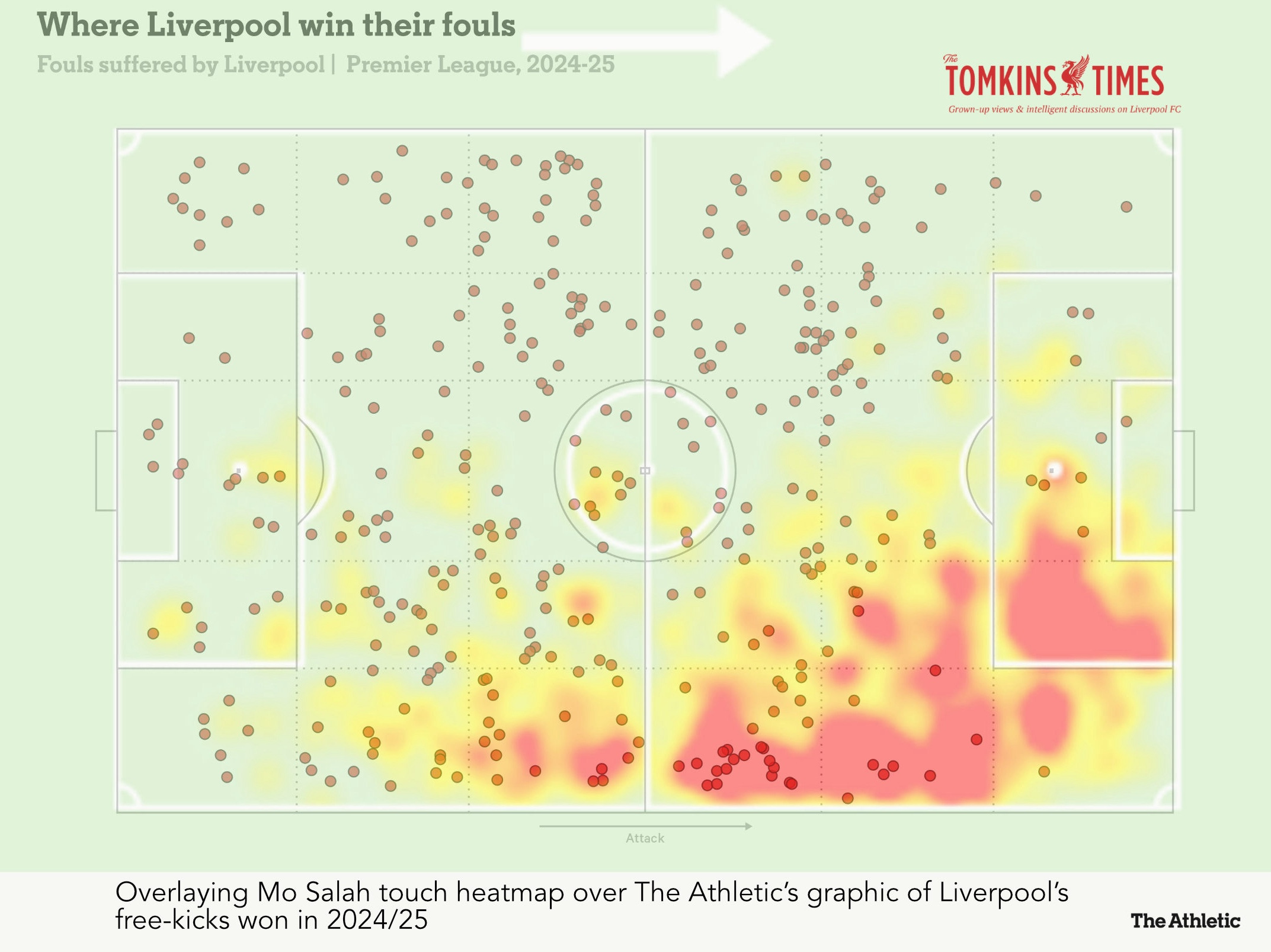I can’t give you map locations for all fouls in the c.10,000 games, as I can’t access that level of detail, but this below was published by The Athletic in early May 2025, and you can see that there was no danger of Liverpool getting a free-kick within a full six-yard box outside the box, nor on the right wing, where Mo Salah put in one of the most dominant displays ever seen in English football; there’s a barren foul landscape, with his heat map of Salah’s touches overlaid by me.