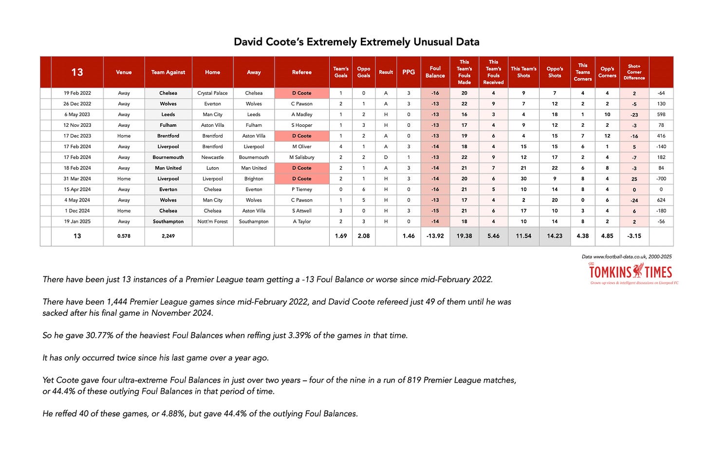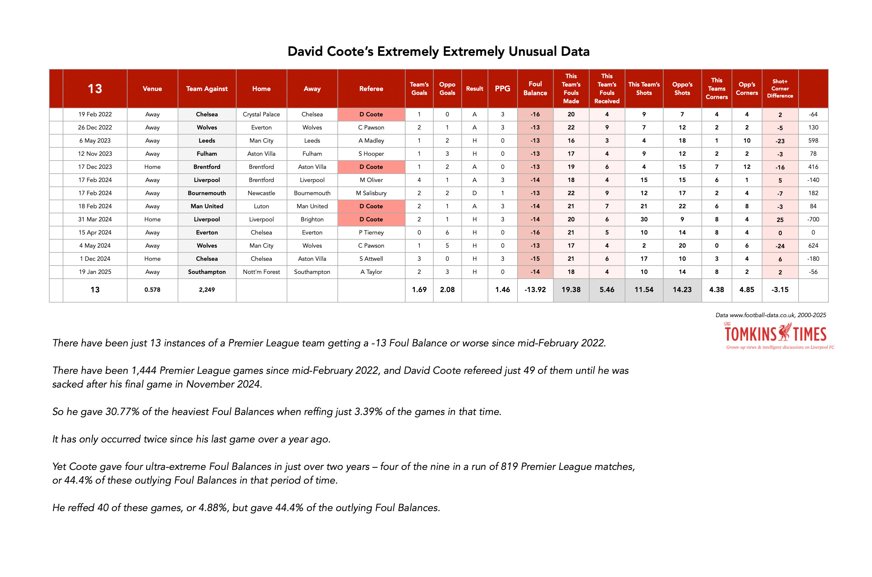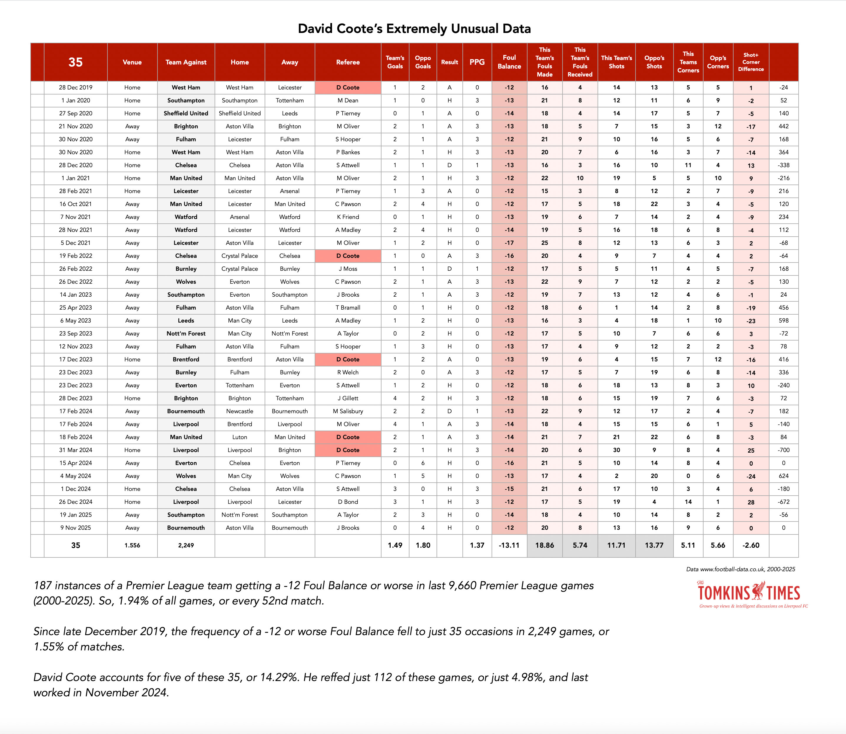 In a two-year period there were only nine ultra-extreme Foul Balances, and Coote was responsible for FOUR of them. (No other ref appears more than once.)