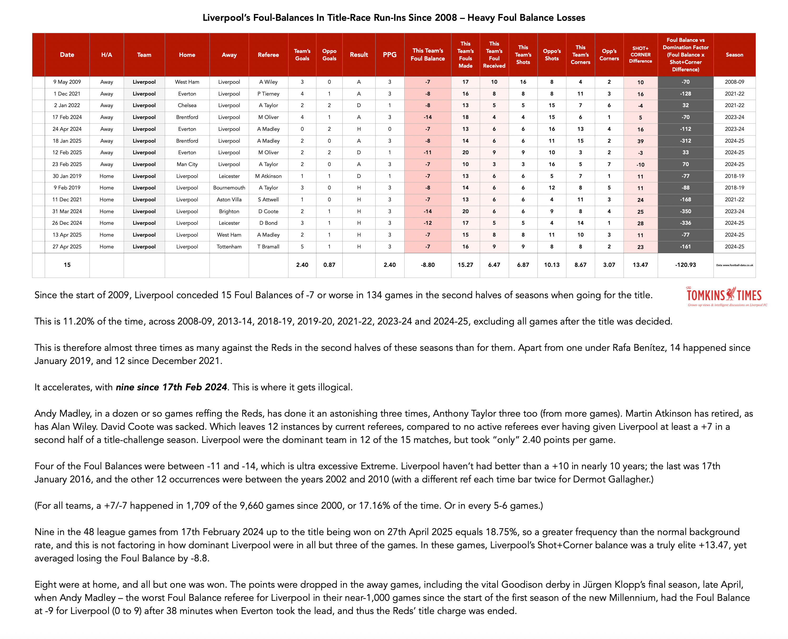 Since the end of 2024, Liverpool have won 15 foul free-kicks in a game just twice (Pawson is again one of the only refs to give Liverpool a normal distribution of anything).