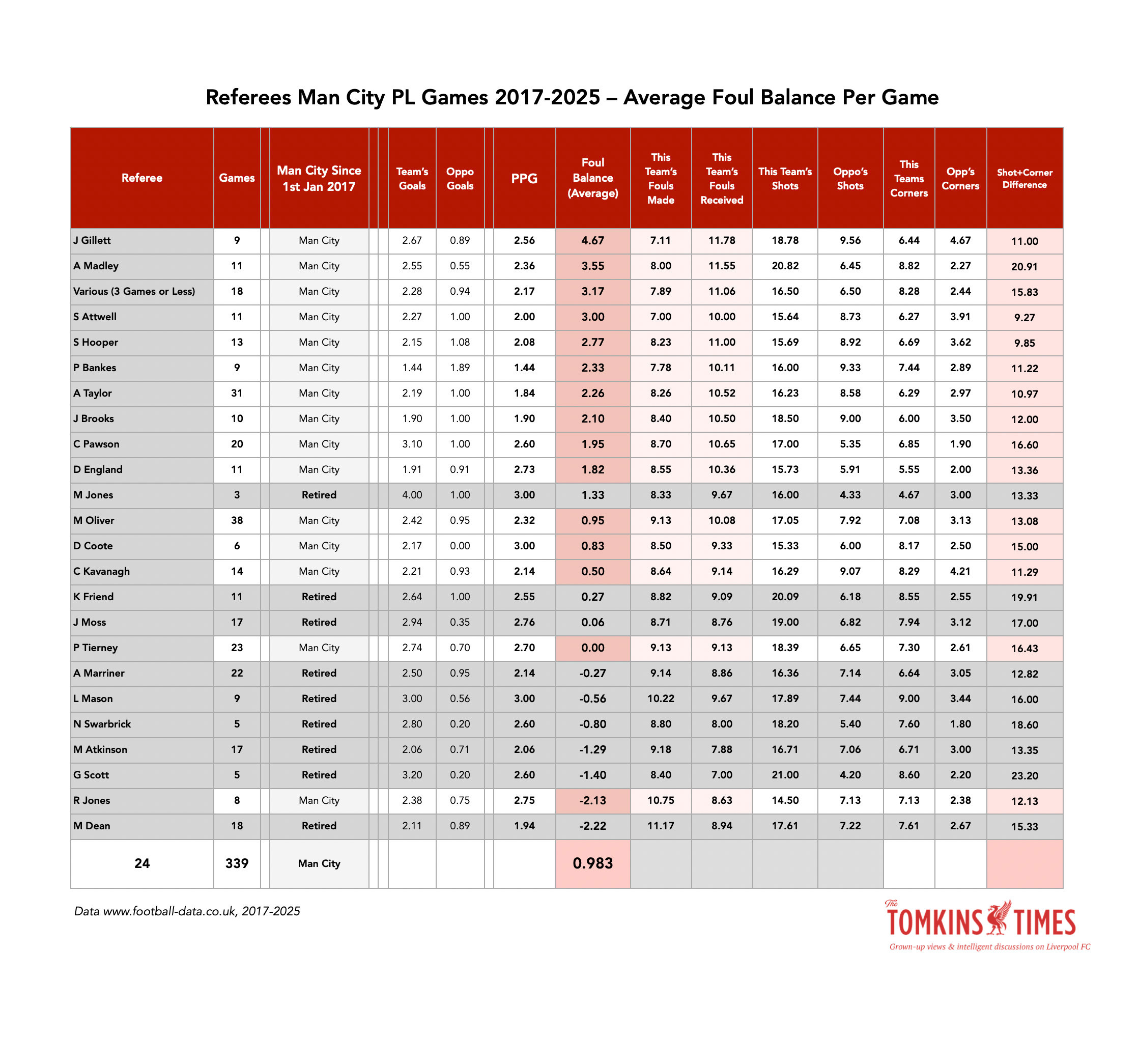 Craig Pawson’s data seems normal for both Liverpool and Man City. This makes him the only ref to do so.