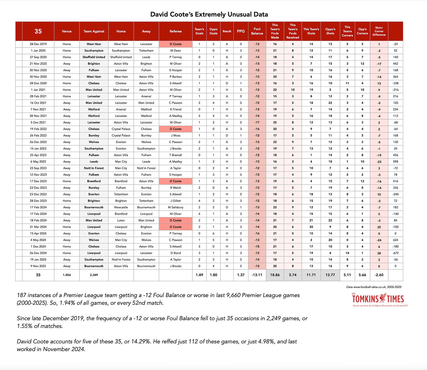 But Coote’s most suspicious game was Liverpool vs Brighton, March 2024. Liverpool battered Brighton all game but ended with only six free-kicks won to 20 conceded; an ultra-rare -14 Foul Balance, even more rare for a home team and super-super-rare for a home team absolutely bossing the ball, the shots and the corners.